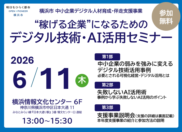 横浜市では企業のDX・デジタル化を推進し、市内経済の活性化を図るため、デジタル化推進を担う人材の育成及び経営課題の解決に必要なデジタル技術の導入や活用方法を提案する伴走支援を実施します。