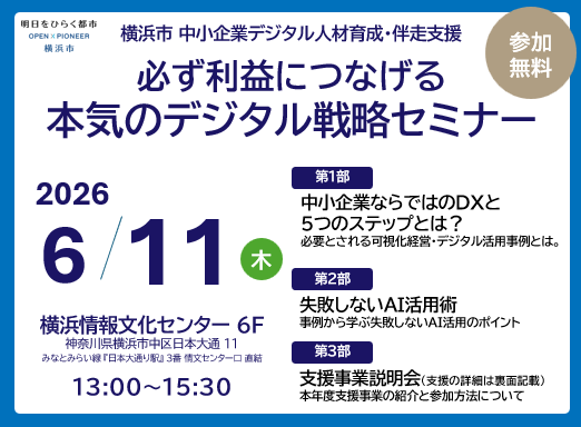 横浜市では企業のDX・デジタル化を推進し、市内経済の活性化を図るため、デジタル化推進を担う人材の育成及び経営課題の解決に必要なデジタル技術の導入や活用方法を提案する伴走支援を実施します。